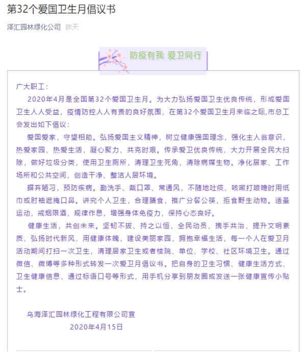 2020年4月是全國第32個愛國衛(wèi)生月。4月15日下午,澤匯園林公司組織廣大職工開展以“防疫有我、愛衛(wèi)同行”為主題的志愿者活動?;顒釉跒鹾:惶柎a頭舉行,公司總經(jīng)理王海軍、副總經(jīng)理康莉萍參加了本次活動。