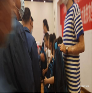 由支部黨員為小朋友發(fā)放愛心書包,并合影留念。
