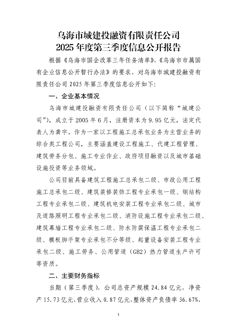 - 2025-04-22烏海市城建投融資有限責(zé)任公司2025年度第一季度信息公開