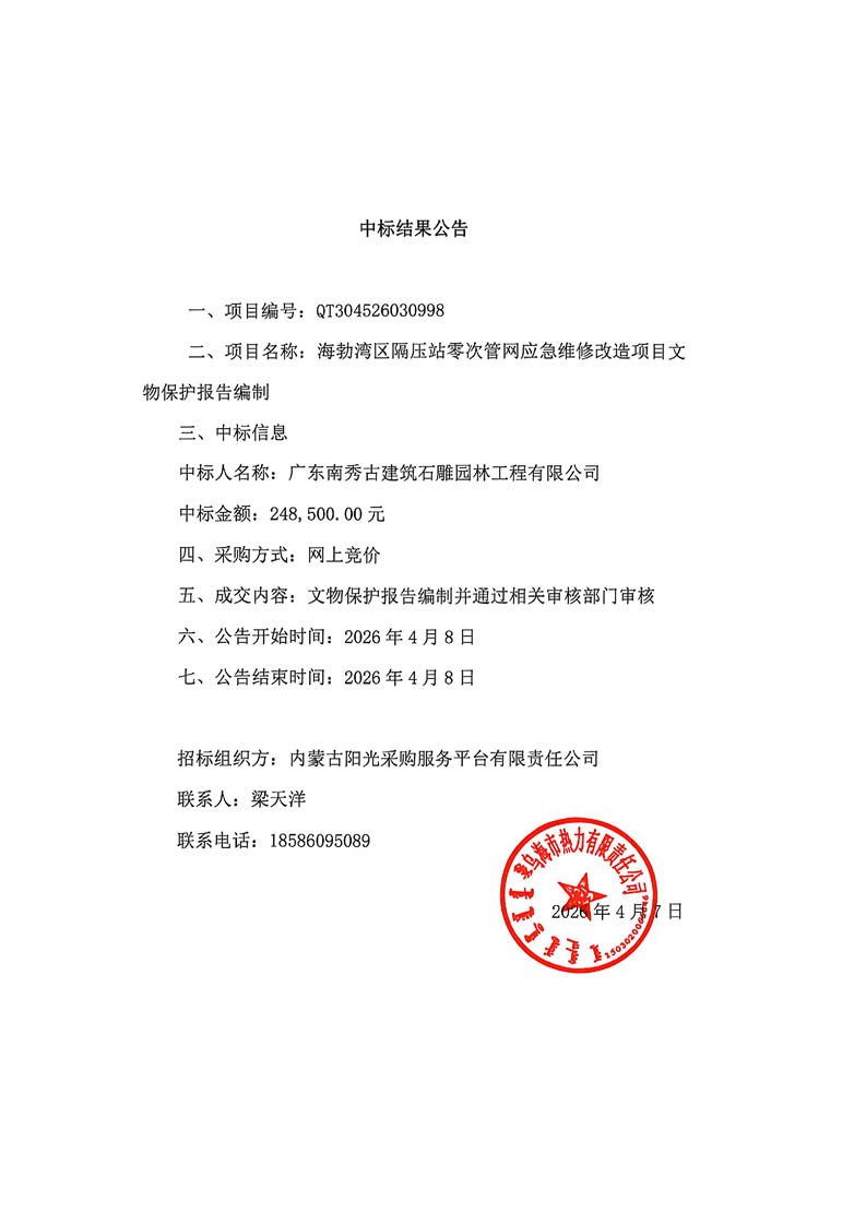 海勃灣區(qū)隔壓站零次管網(wǎng)應(yīng)急維修改造項(xiàng)目文物保護(hù)報(bào)告編制(結(jié)果公告)
